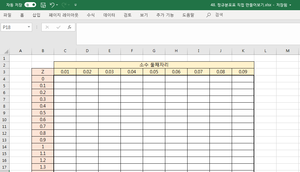 먼저 표준정규분포표의 틀을 만들어봅시다. 아래와 같은 틀을 만들겠습니다.