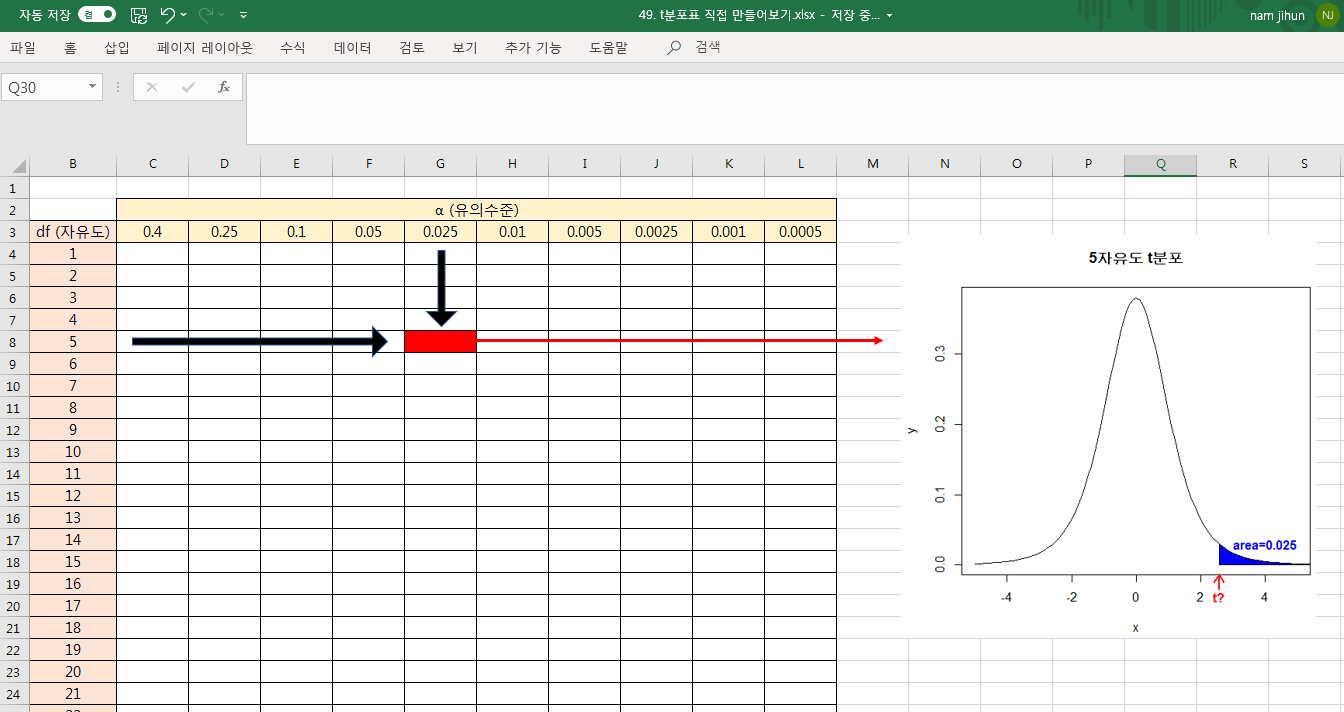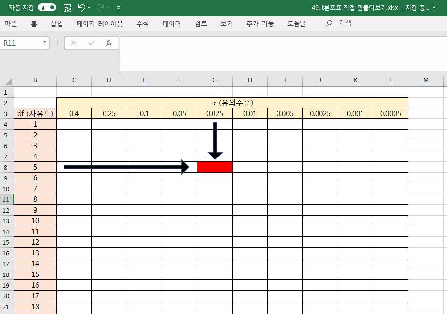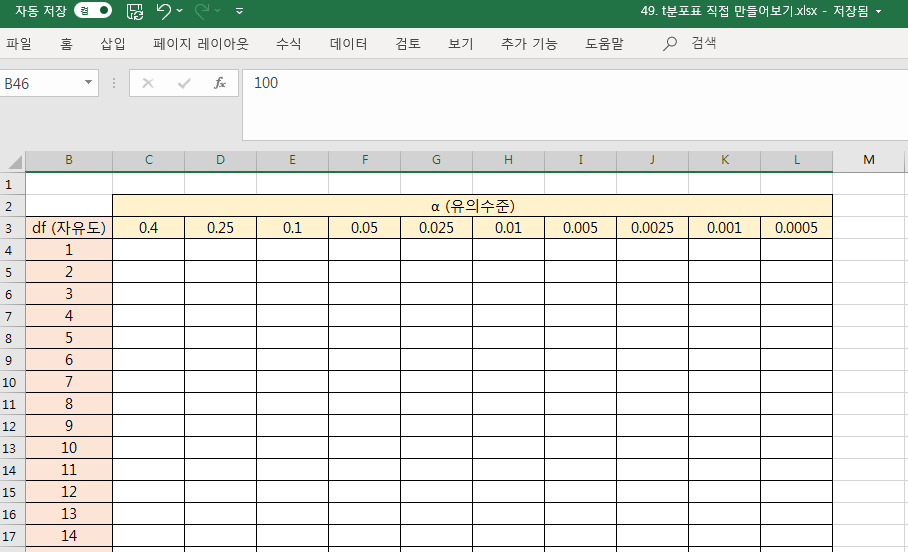 먼저 t분포표의 틀을 만들어봅시다. 아래와 같은 틀을 만들겠습니다.