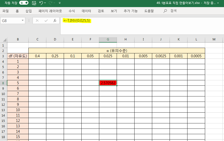 값을 구해봅시다. T.INV 함수를 이용하여 구합니다.