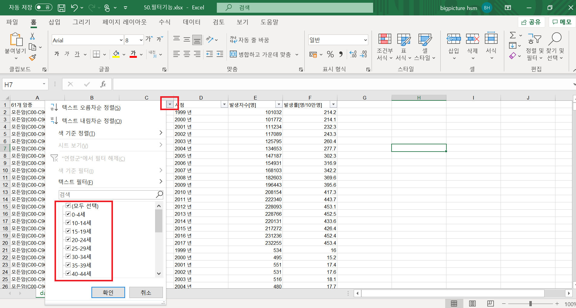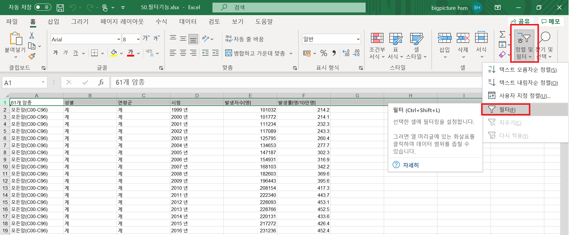 아래 그림과 같이 정렬 및 필터를 클릭하고 필터를 눌러줍니다.