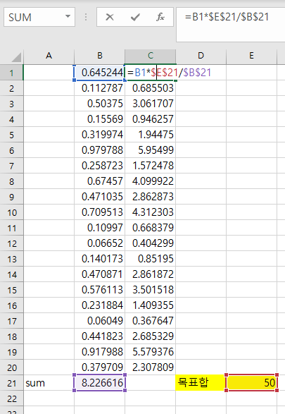 추출한 값에 목표합을 곱하고, 추출한 값의 합을 나눠줍니다.