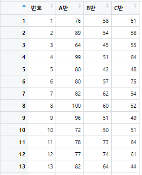 실행시켜보면 View 창이 뜹니다. 세 반 학생의 점수입니다.