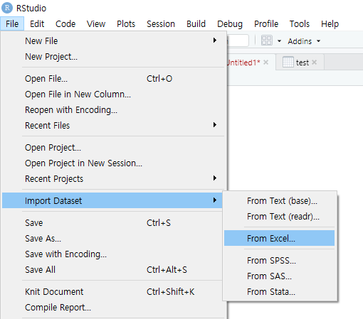 R스튜디오를 열고 [File]-[Import Dataset]-[From Excel] 클릭