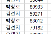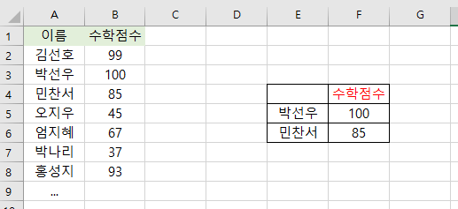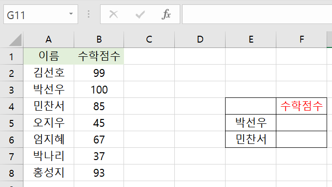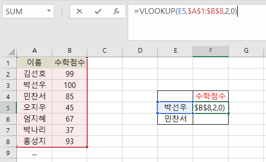 우리는 박선우와 민찬서의 수학점수 데이터를 가져오고 싶습니다. 이때 vlookup 기능을 사용합니다. 아래와 같이 사용합니다.