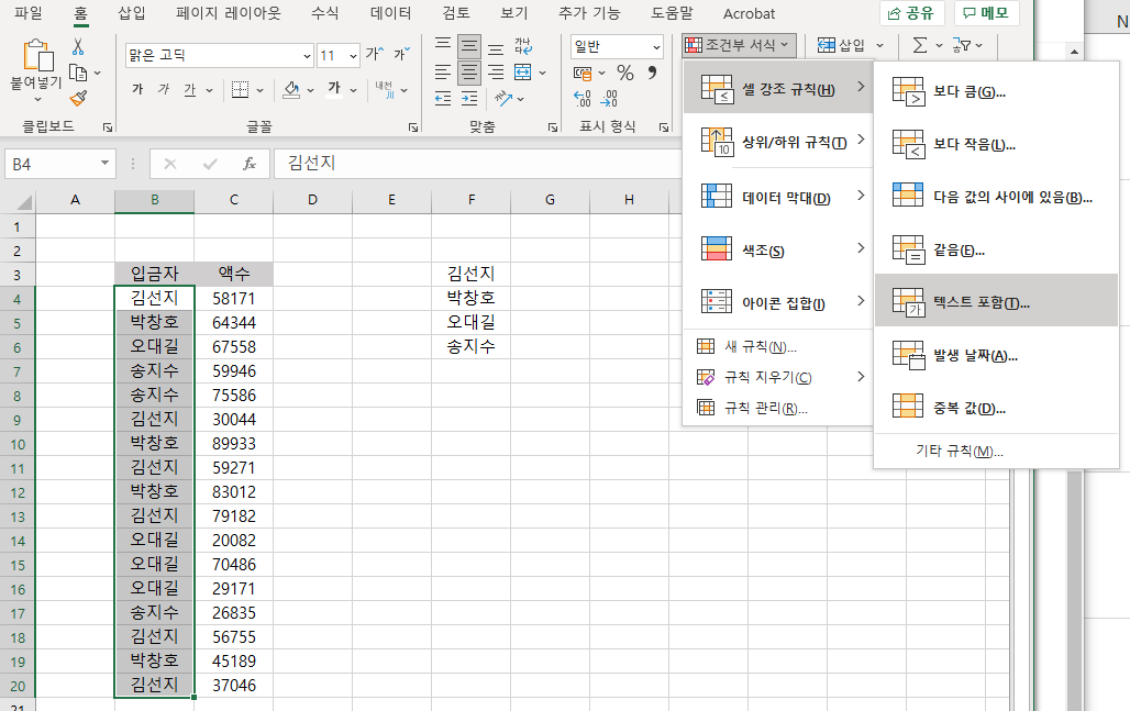 [홈]-[조건부 서식]-[셀 강조 규칙]-[텍스트 포함] 으로 들어갑니다.