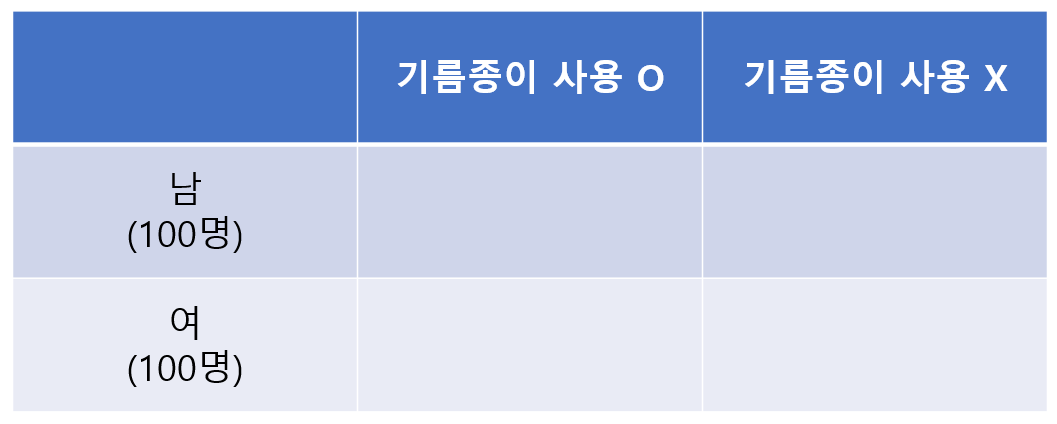 남자 100명과 여자 100명을 임의로 선정하여 기름종이 사용여부를 조사하고 분할표로 만드는 예시입니다.