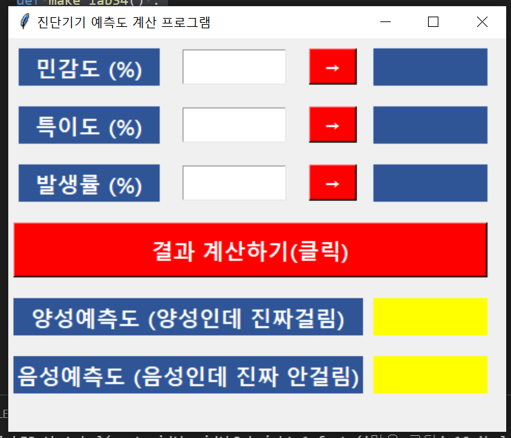진단키트의 민감도, 특이도, 질병발생률을 입력하면 음성예측도와 양성예측도를 알려주는 프로그램입니다. 언어는 파이썬을 이용하겠습니다.