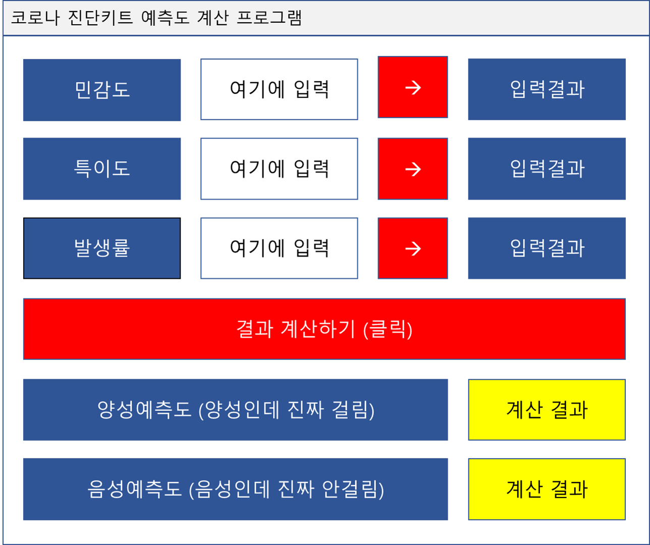 입력값은 민감도, 특이도, 발생률입니다. 출력값은 양성예측도, 음성예측도입니다.