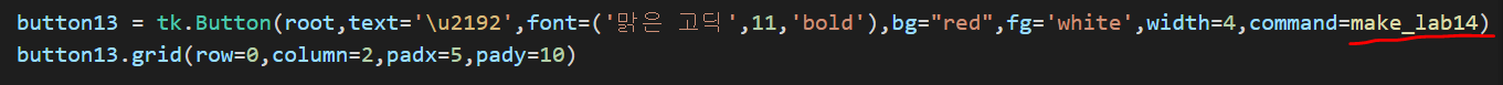 button13 = tk.Button(root,text='\u2192',font=('맑은 고딕',11,'bold'),bg="red",fg='white',width=4,command=make_lab14)
