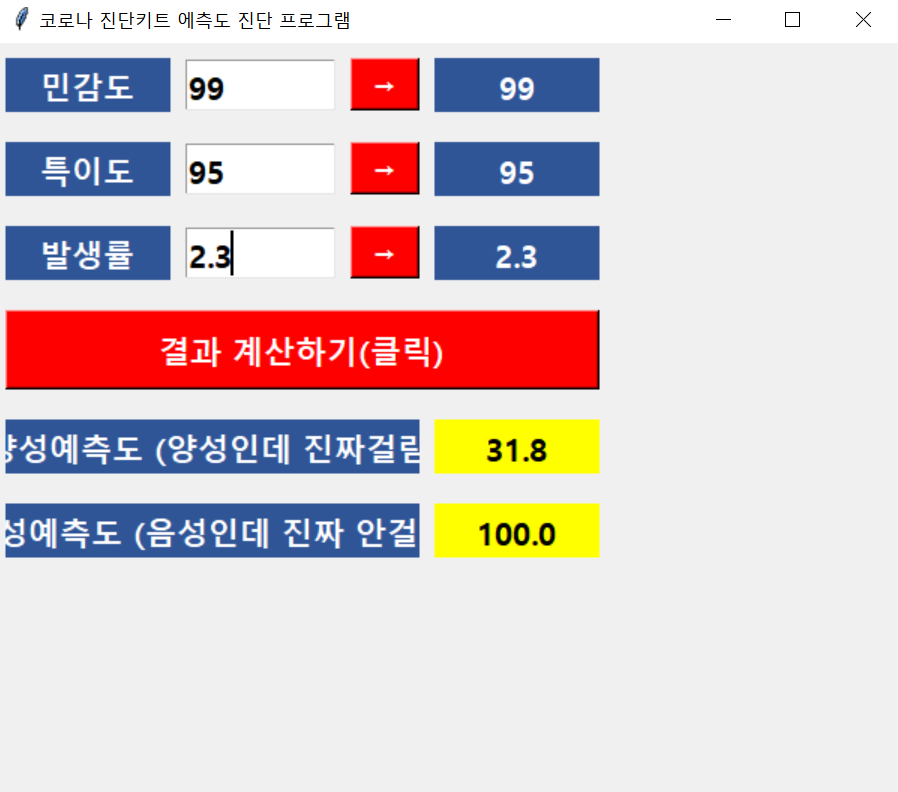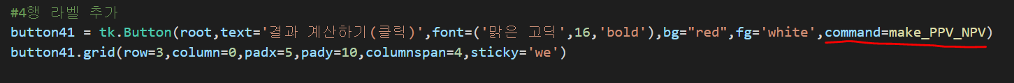 button41 = tk.Button(root,text='결과 계산하기(클릭)',font=('맑은 고딕',16,'bold'),bg="red",fg='white',command=make_PPV_NPV)