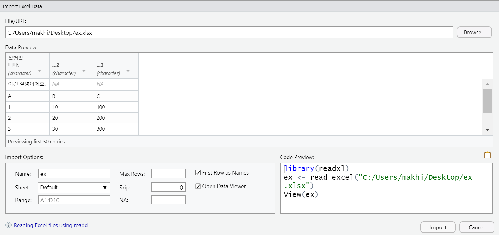 첫 두줄은 설명입니다. R에서 불러올 때 설명줄은 생략하고 불러오는 방법을 알아봅시다.