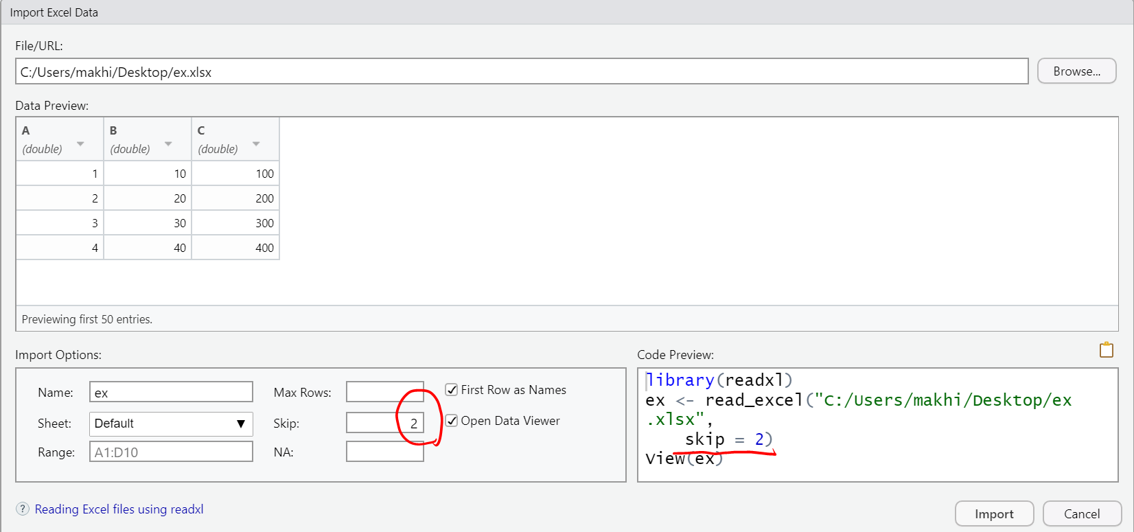 첫 두 줄을 생략하려면 Skip 에 2를 넣으면 됩니다.