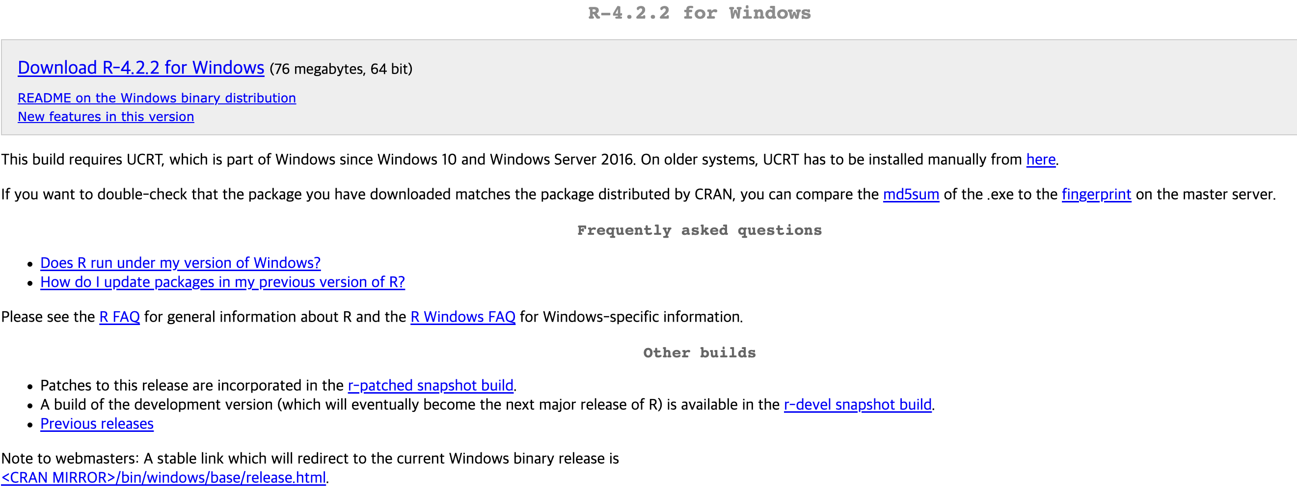 가장 처음나오는 링크에 들어갑니다. Download R-4.2.2 for Windows 가 보이시죠. 클릭하면 다운로드가 시작됩니다.