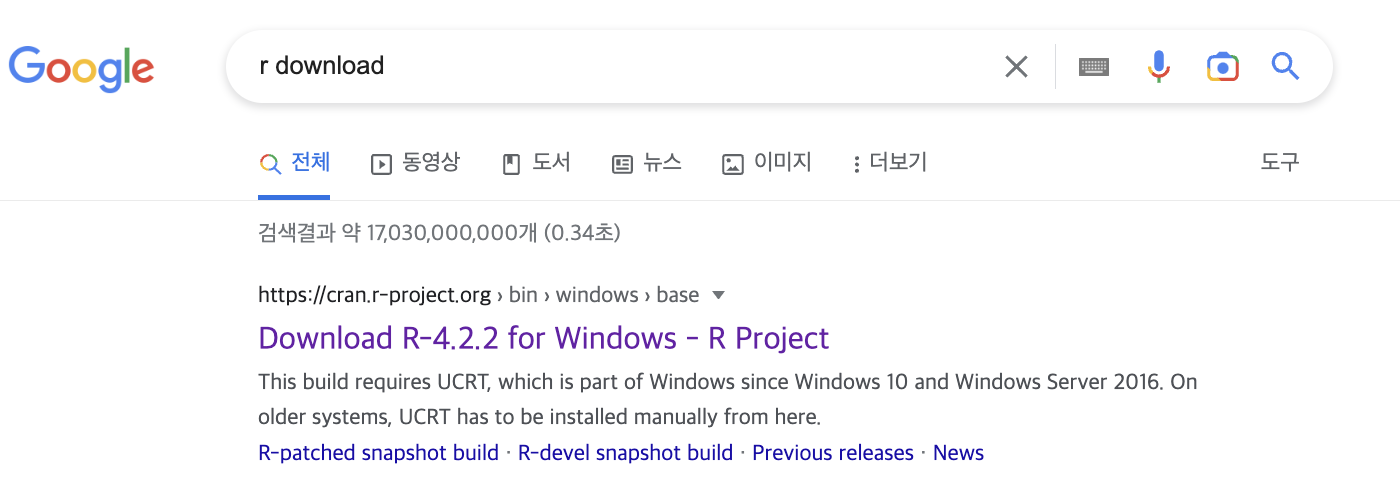 R을 배우려면 먼저 R을 설치해야합니다. R과 R스튜디오를 설치할 것입니다. R스튜디오는 R을 편하게 쓸 수 있도록 만들어진 소프트웨어입니다. R스튜디오는 R이 설치되어 있어야 사용이 가능합니다. R을 먼저 설치합시다. 제가 사용하는 운영체제는 윈도우라서 윈도우를 기준으로 설명하겠습니다.