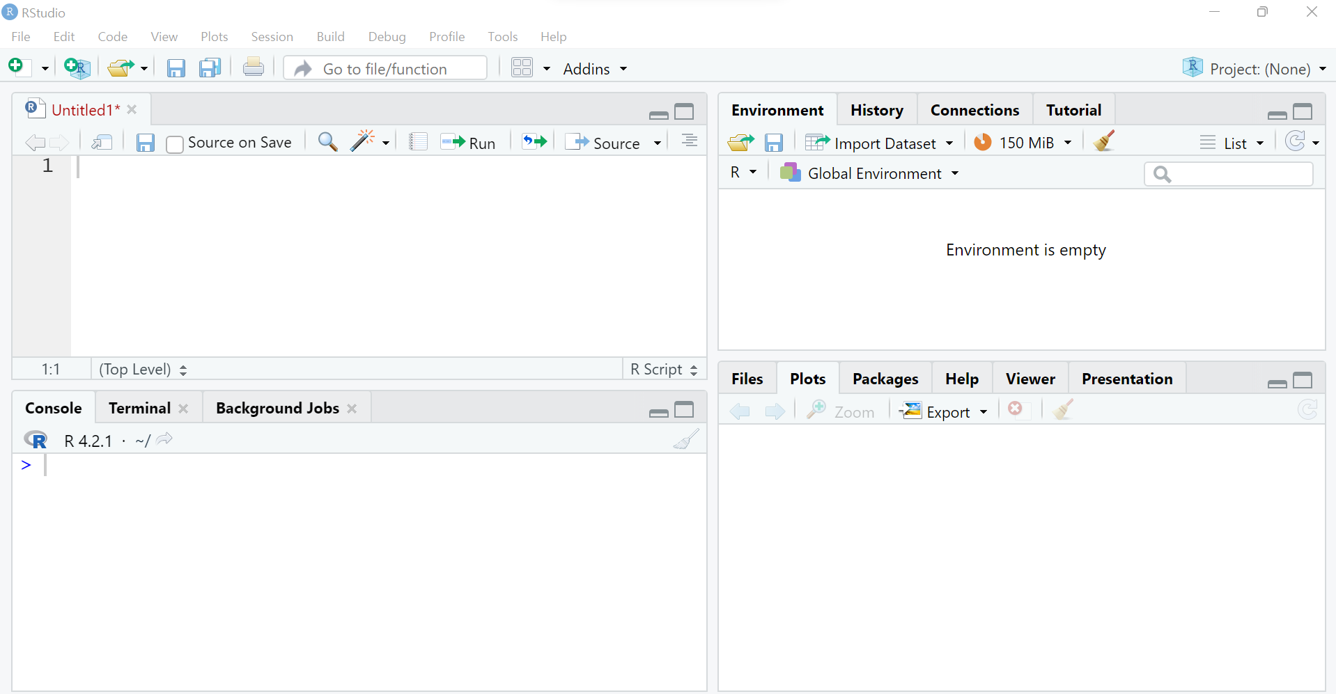 R스튜디오를 실행해봅시다. 아래와 같이 화면이 4분할 되어 있을 겁니다. 일단은 Console 이라는 곳만 알면 됩니다. 코드를 입력하는 곳입니다. 커서가 깜빡이고 있을겁니다.