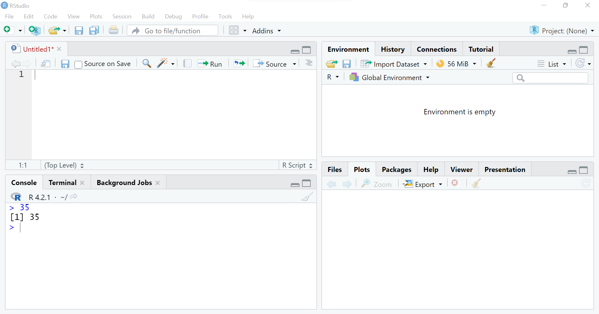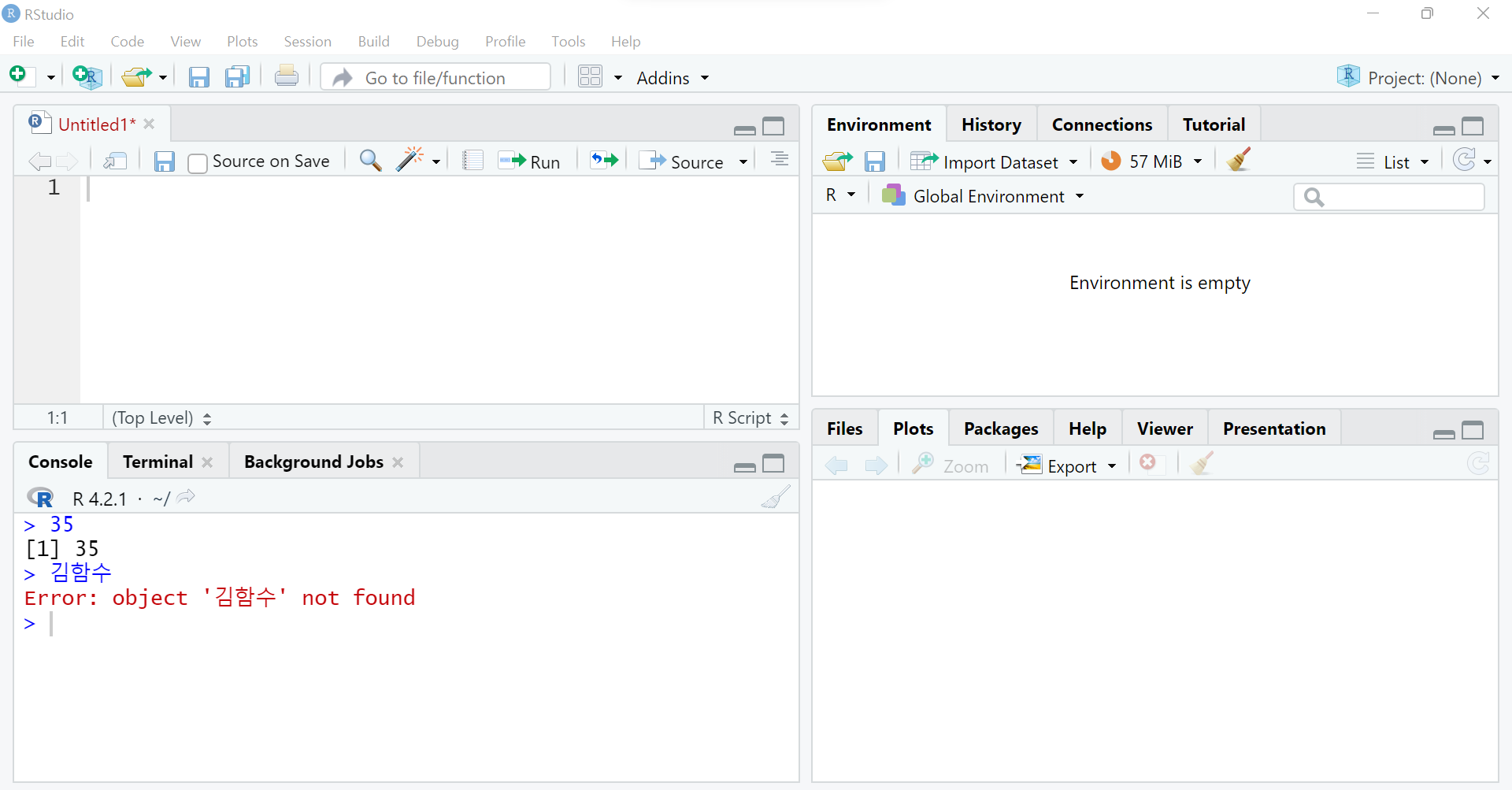 위 데이터를 R에 입력하고 싶은 상황이라고 합시다. 먼저 숫자와 문자가 입력되는지를 확인해야 합니다. R스튜디오 콘솔창에 35라고 입력해봅시다.