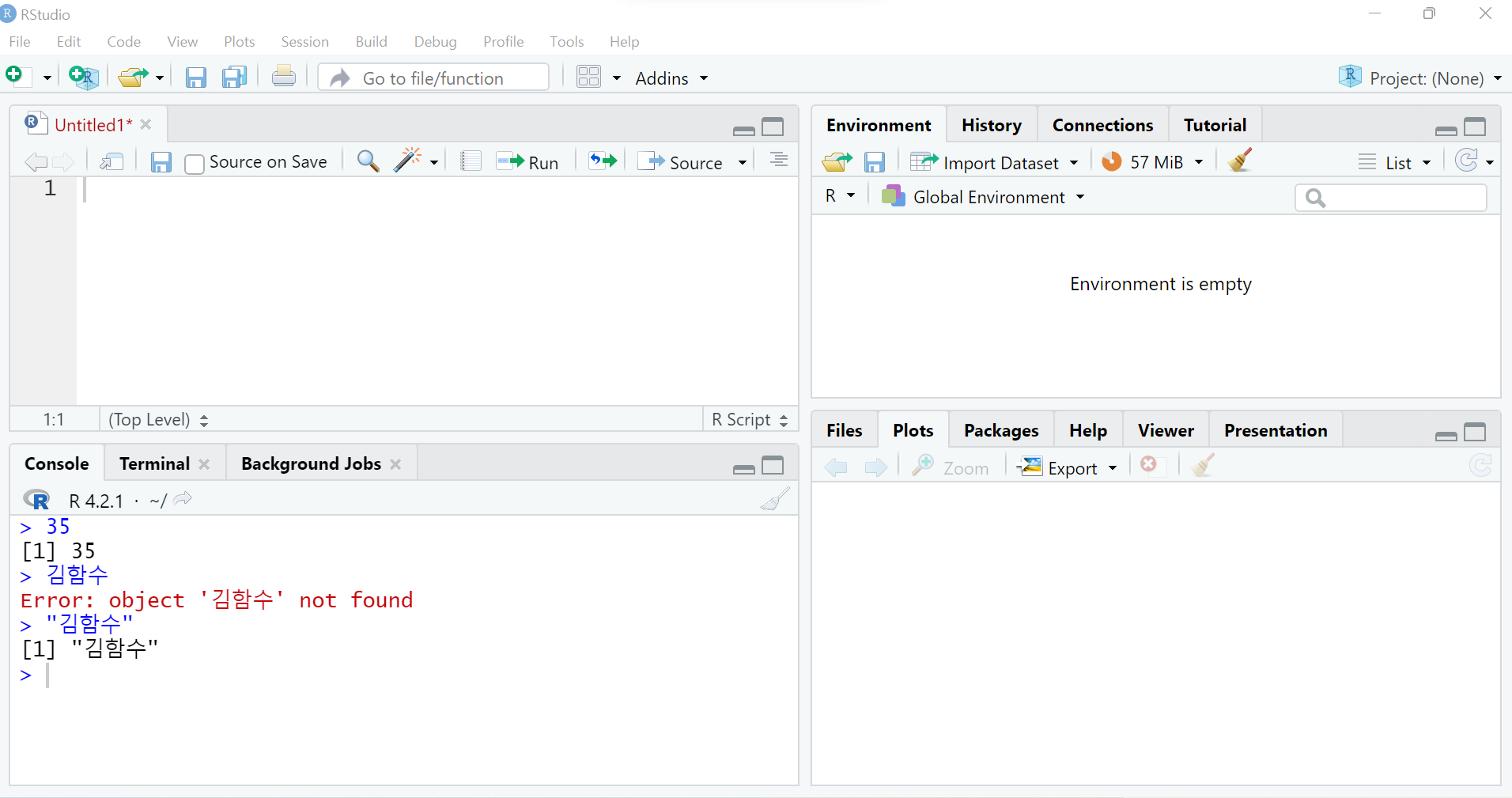 입력이 잘 됩니다. R은 숫자를 인식한다는 것을 알 수 있습니다. 이번에는 문자를 입력해봅시다. 김함수라고 입력합시다.