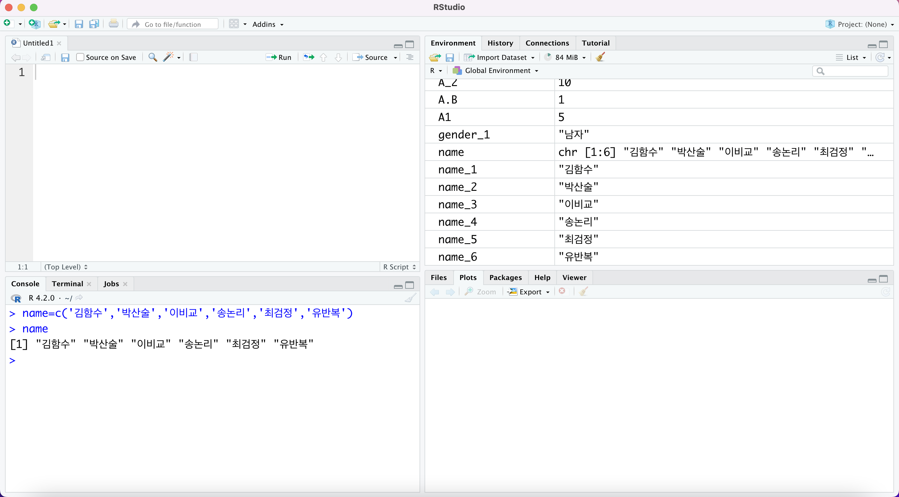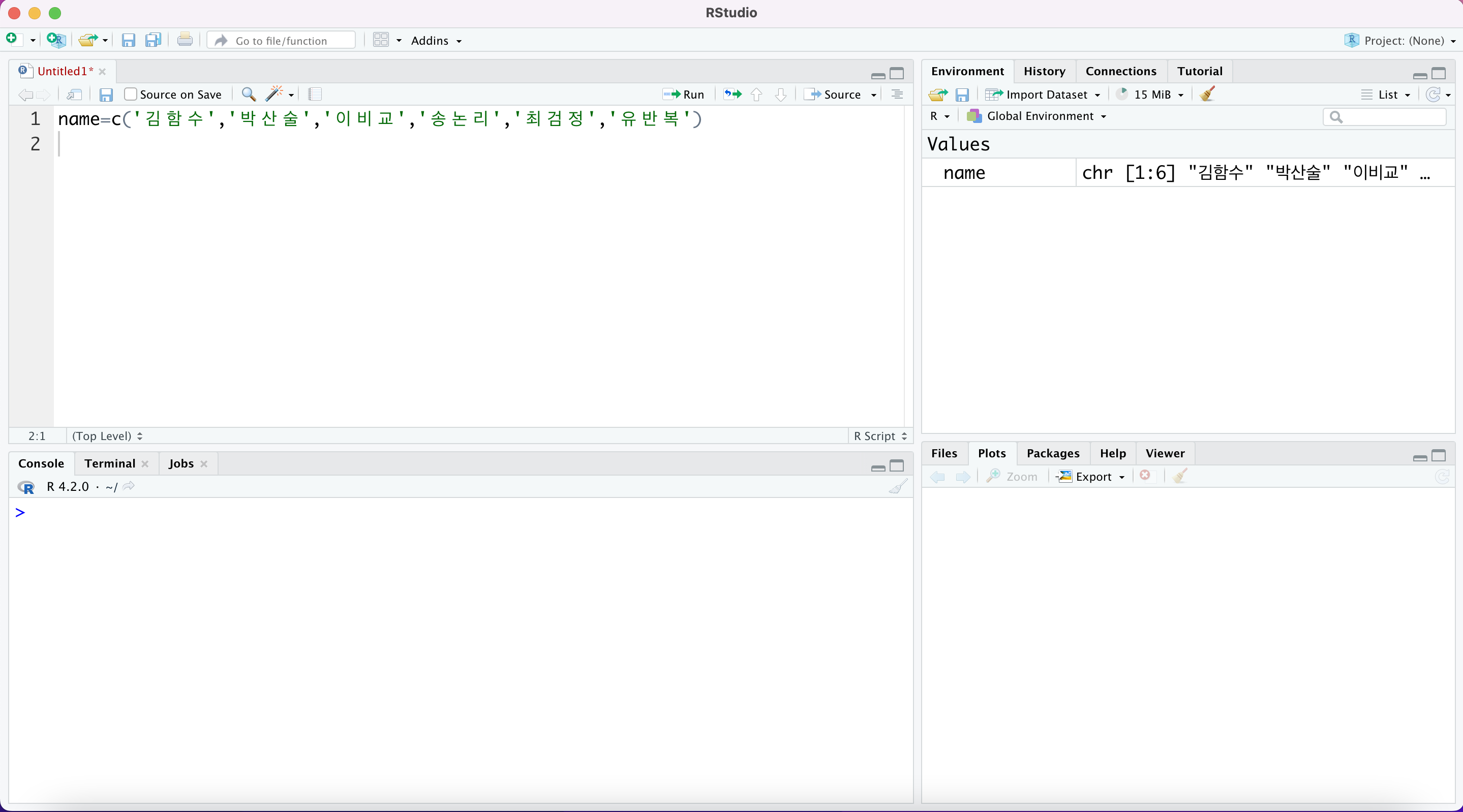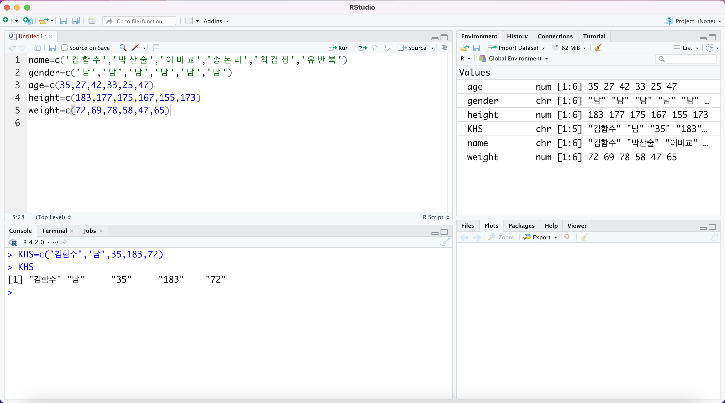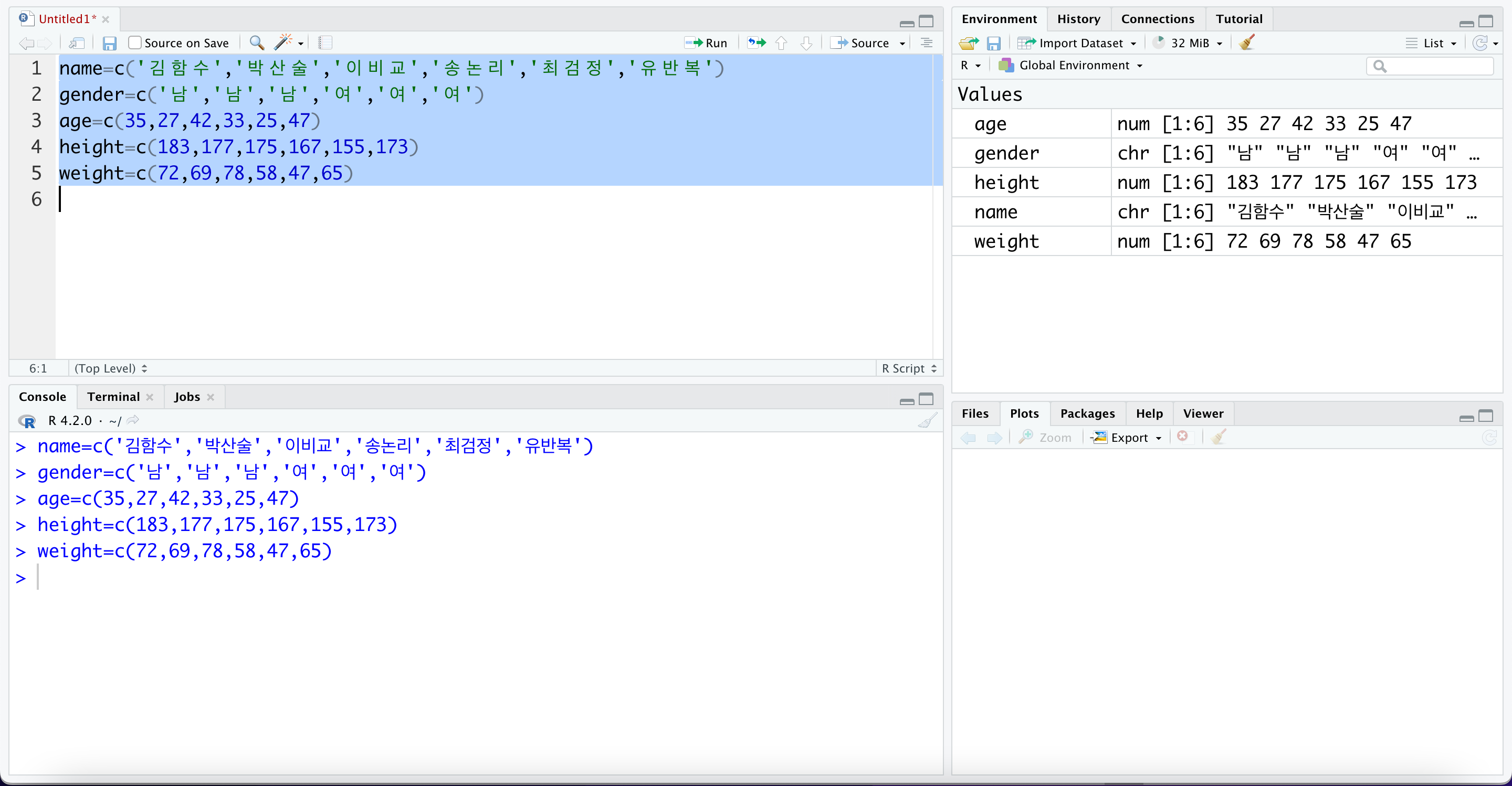 사람 이름으로 변수를 만들고, 각 사람의 정보를 벡터로 입력하는 것입니다. 콘솔창에 입력해봅시다.