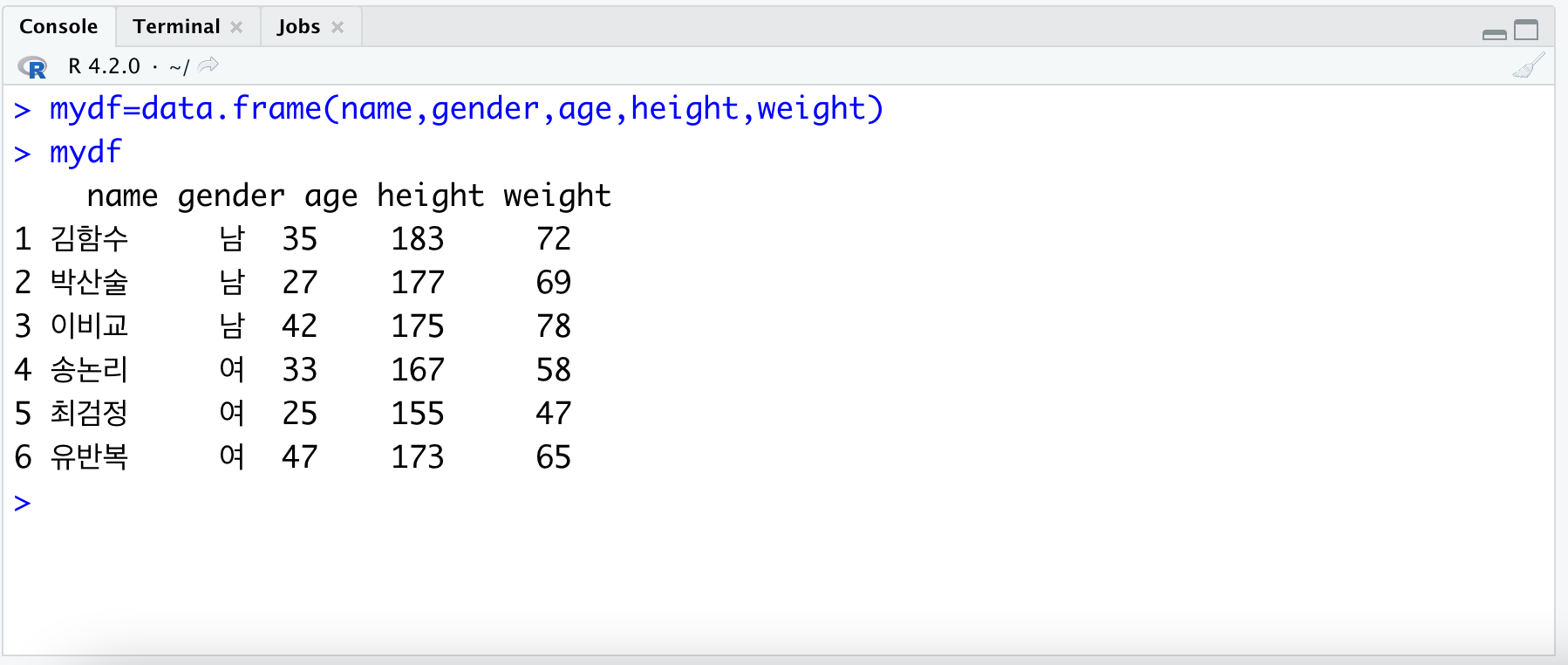 위에서 정의한 벡터들을 가지고 데이터 프레임을 만들어보겠습니다. 데이터프레임을 만들 때는 data.frame( ) 함수를 사용합니다. 괄호 안에 벡터를 만든 변수 이름을 콤마로 구분하여 넣어주면 됩니다.