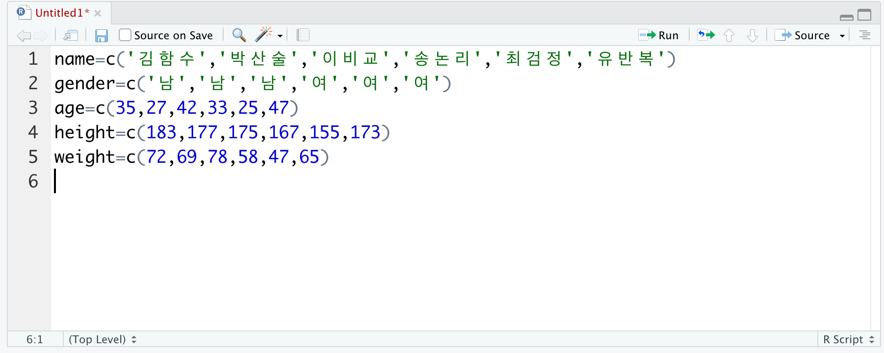 스크립트 창에서 name, gender, age, height, weight 라는 변수에 위 데이터를 입력해봅시다.