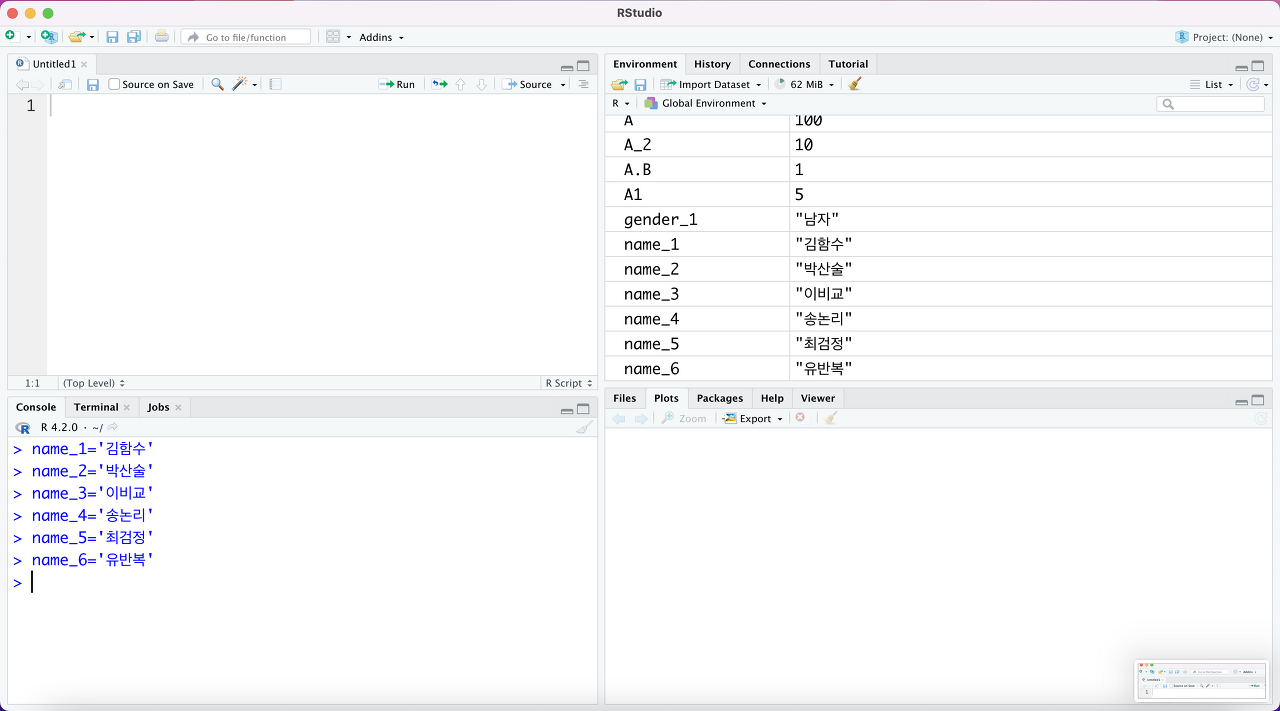 이제부터는 name 이라는 변수만 입력하면 여섯명의 이름을 언제 어디서든 한번에 가져올 수 있습니다. 자료구조와 변수를 사용하면 얼마나 편해지는지 감이 오시면 좋겠습니다. 아마 어떤 분들은 이름을 잘못 입력하신 분들도 계실겁니다. 김함수를 김한수로 잘못 입력했다고 해봅시다. 콘솔창을 이용하는 경우 한번 입력하면 이미 입력한 코드에 대해서는 수정이 불가능합니다. 수정된 코드를 다시 입력해주어야 합니다. 코드를 어딘가 적어놓고, 수정하면서 실행도 해보면 참 좋을 것 같은데요. 그 기능이 콘솔창 바로 위에 있는 스크립트 창입니다.