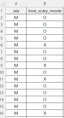 남자 10명과 여자 10명을 대상으로 무서운 영화 선호 여부를 조사한 것입니다. 우리는 위 데이터를 아래와 같은 형태의 표로 만들고 카이제곱검정을 하고 싶은 상황입니다.