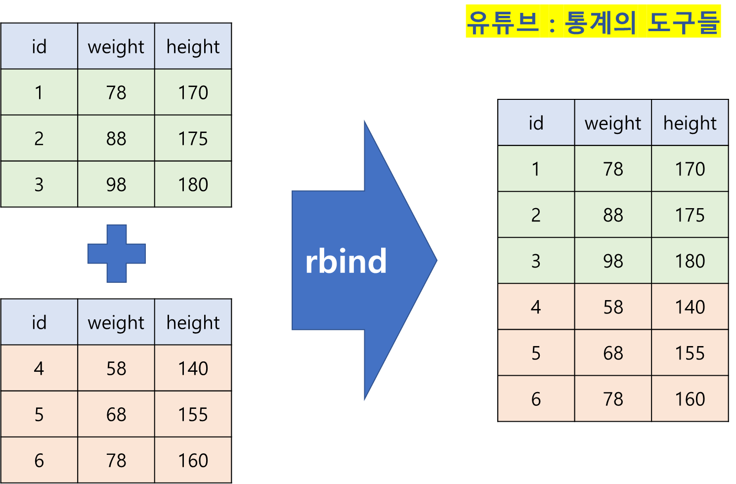 데이터프레임을 행으로 결합하는 방법을 알아봅시다. 행으로 결합한다는 것은 아래와 같은 결합을 뜻합니다.