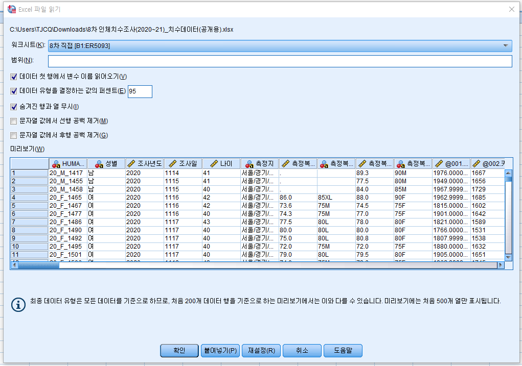 2) 데이터 첫 행에서 변수 이름 읽어오기가 체크되어 있는지 확인하고 확인을 눌러줍니다.