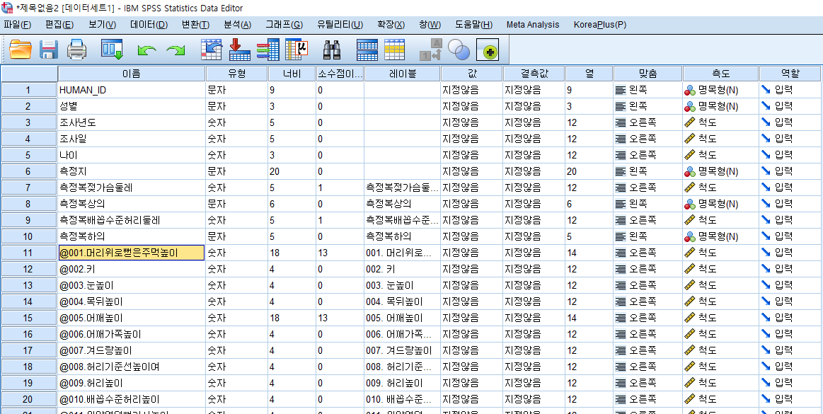 4) 아래쪽에 있는 '변수 보기' 탭을 클릭합니다. 측도열을 보고 제대로 설정되었나 확인합니다. 명목형은 성별, 혈액형과 같은 범주형 변수이고 척도는 수치형입니다.