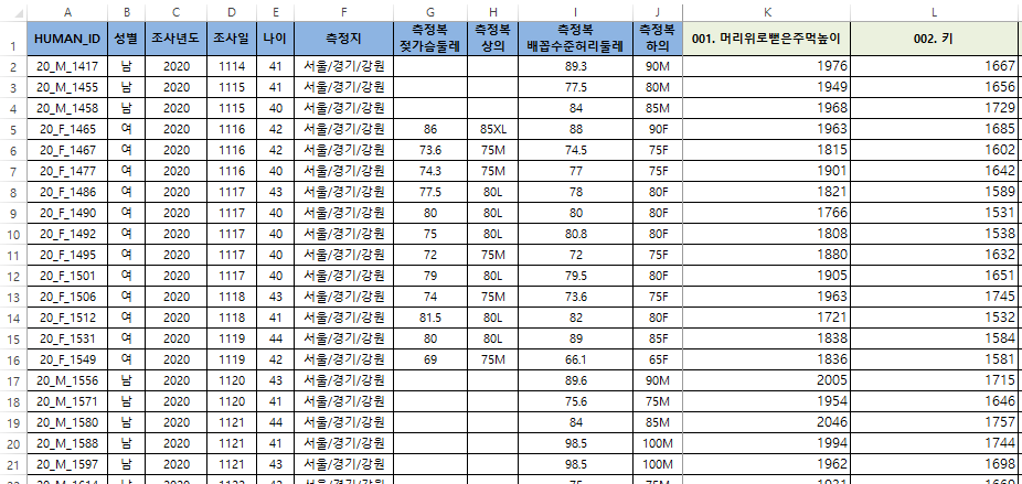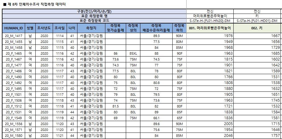 이번 시간에는 앞으로 사용할 데이터를 소개하겠습니다. 한국인인체치수조사 기관인 '사이즈 코리아'에서 제공하는 데이터로 8차 인체 치수조사 데이터입니다. 사이즈 코리아 사이트에서 받으셔도 되고, 아래 링크에서 받으셔도 됩니다.
