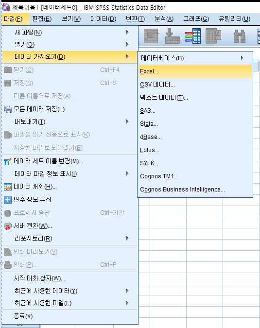 1) [파일]-[데이터 가져오기]-[Excel] 을 클릭합니다.