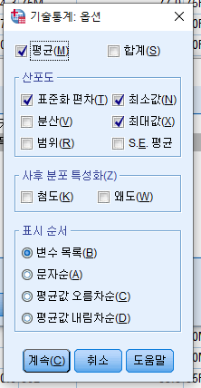3) 옵션을 클릭해봅시다. 체크한 값들이 결과로 출력됩니다. 중간값과 분위수는 없네요.