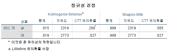 정규성검정 결과를 보여줍니다. 유의확률이 0.05보다 크면 정규분포를 따른다고 가정할 수 있습니다.