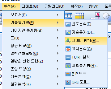 1) [분석]-[기술통계량]-[데이터탐색] 를 클릭합니다.