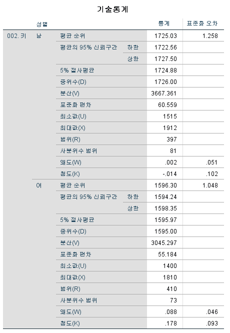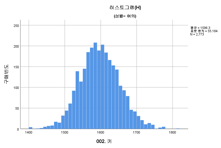 히스토그램을 보여줍니다. 여성의 경우 정규성검정은 기각되었지만, 히스토그램 형태로 보아 정규성을 가정할 수 있어 보입니다.