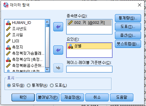 2) 궁금한 변수들을 선택합니다. 동시에 여러변수를 선택해도 됩니다. 성별에 따른 키가 궁금해서 아래와 같이 입력했습니다. 종속변수에 키, 요인에 성별을 넣으면 됩니다.