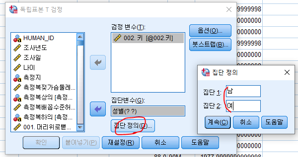 3) 집단정의를 클릭하고, 집단1에 '남'을 집단2에 '여'를 입력합니다.