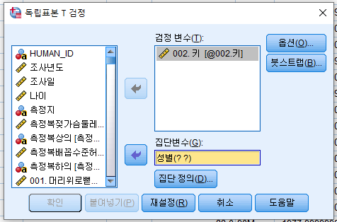 2) 검정변수에 키를 선택하고, 집단변수에 성별을 선택합니다.
