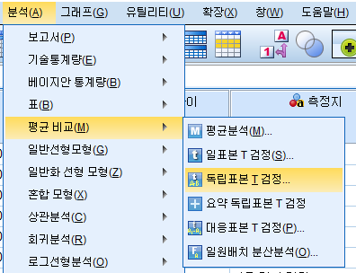 1) [분석]-[평균비교]-[독립표본 t검정] 를 클릭합니다.
