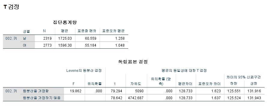 등분산 검정 유의확률이 0.05보다 작으면 등분산 가정이 기각됩니다. 이때는 "등분산을 가정하지 않음"행의 t검정 결과를 보아야 합니다. t검정 유의확률이 0.05보다 작으므로 두 집단의 평균이 같다는 가정이 기각됩니다. 남자와 여자의 키에는 유의차가 있다고 할 수 있습니다.