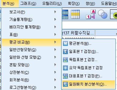 1) [분석]-[평균비교]-[일원배치 분산분석]을 클릭합니다.