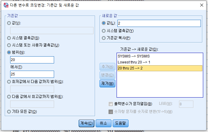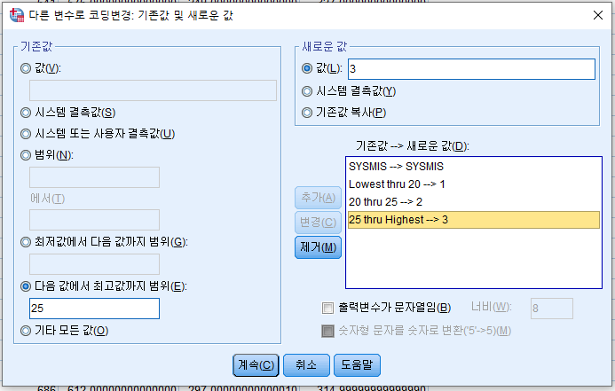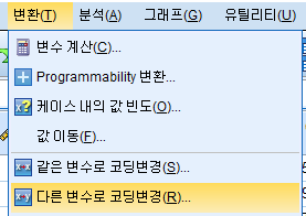 2) [변환]-[다른 변수로 코딩변경]을 클릭합니다.