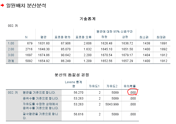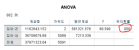 분산의 동질성 검정에서 유의확률이 0.05보다 작으므로, 등분산성이 기각됩니다. 등분산을 만족하지 않을 경우 welch's 분산분석을 사용해야하는데 일단은 만족한다고 가정하고 진행합시다.