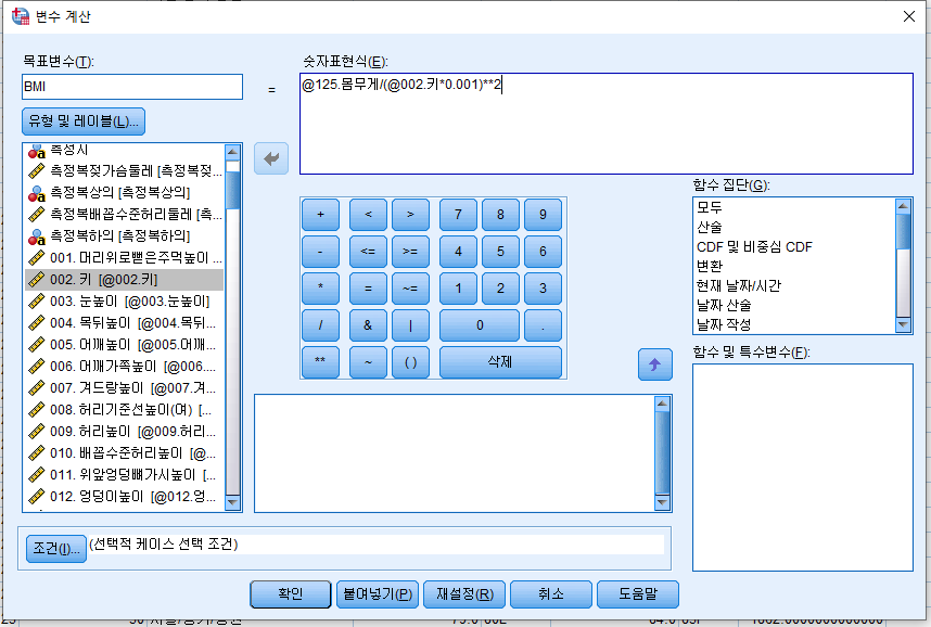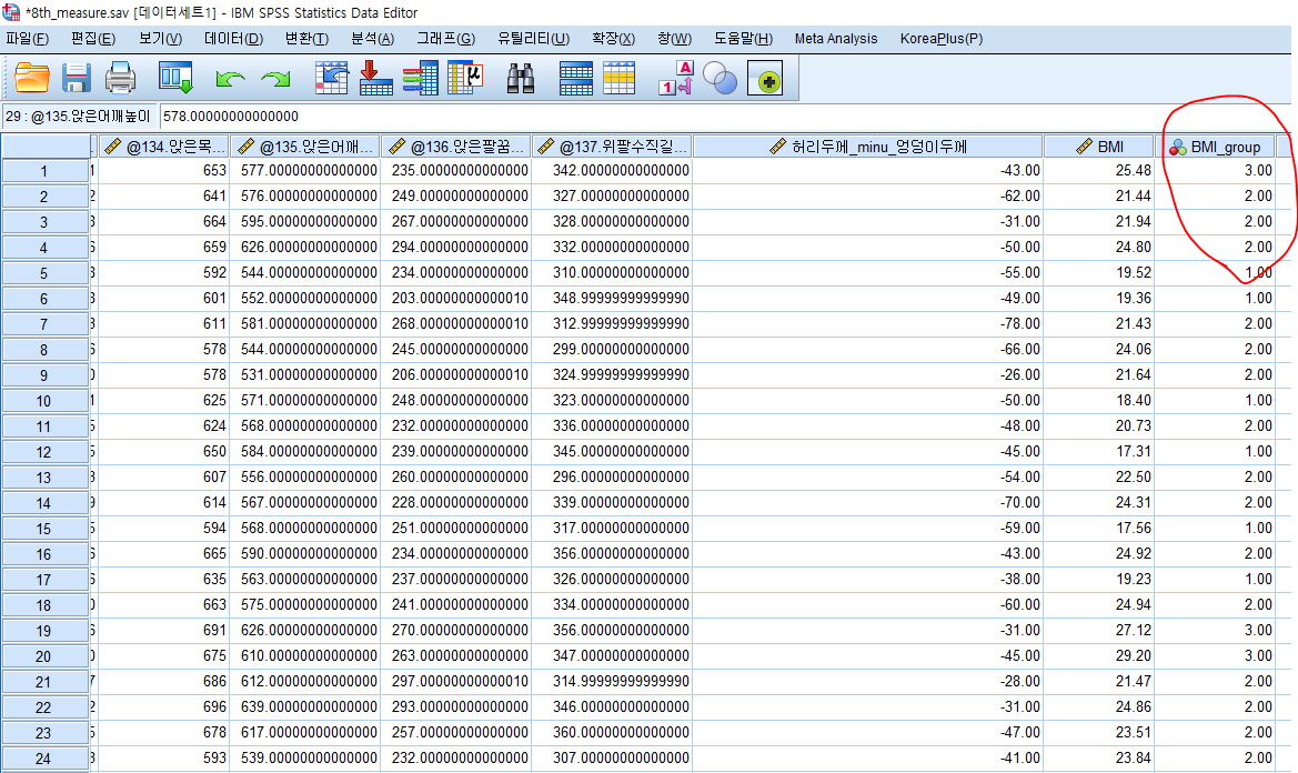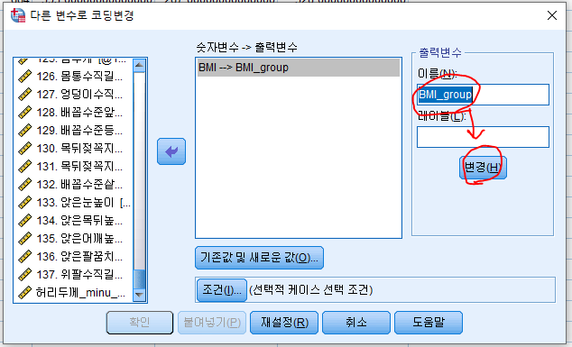 8) 확인을 클릭하면 아래와 같이 BMI_group 변수가 생성됩니다.