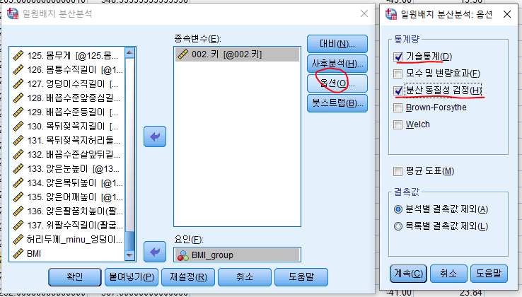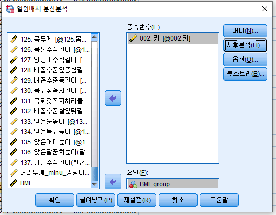 2) 종속변수에 '키'를 입력하고 요인에 'BMI_group'을 입력합니다.