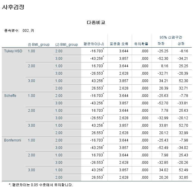 유의확률이 0.05보다 작으므로 세 집단의 평균이 같다는 가설이 기각됩니다. 세 집단 중 적어도 두 집단은 평균의 유의차가 있는 것입니다. 어떤 집단 사이의 유의차가 있는지 알아보기 위해 사후검정을 합니다.